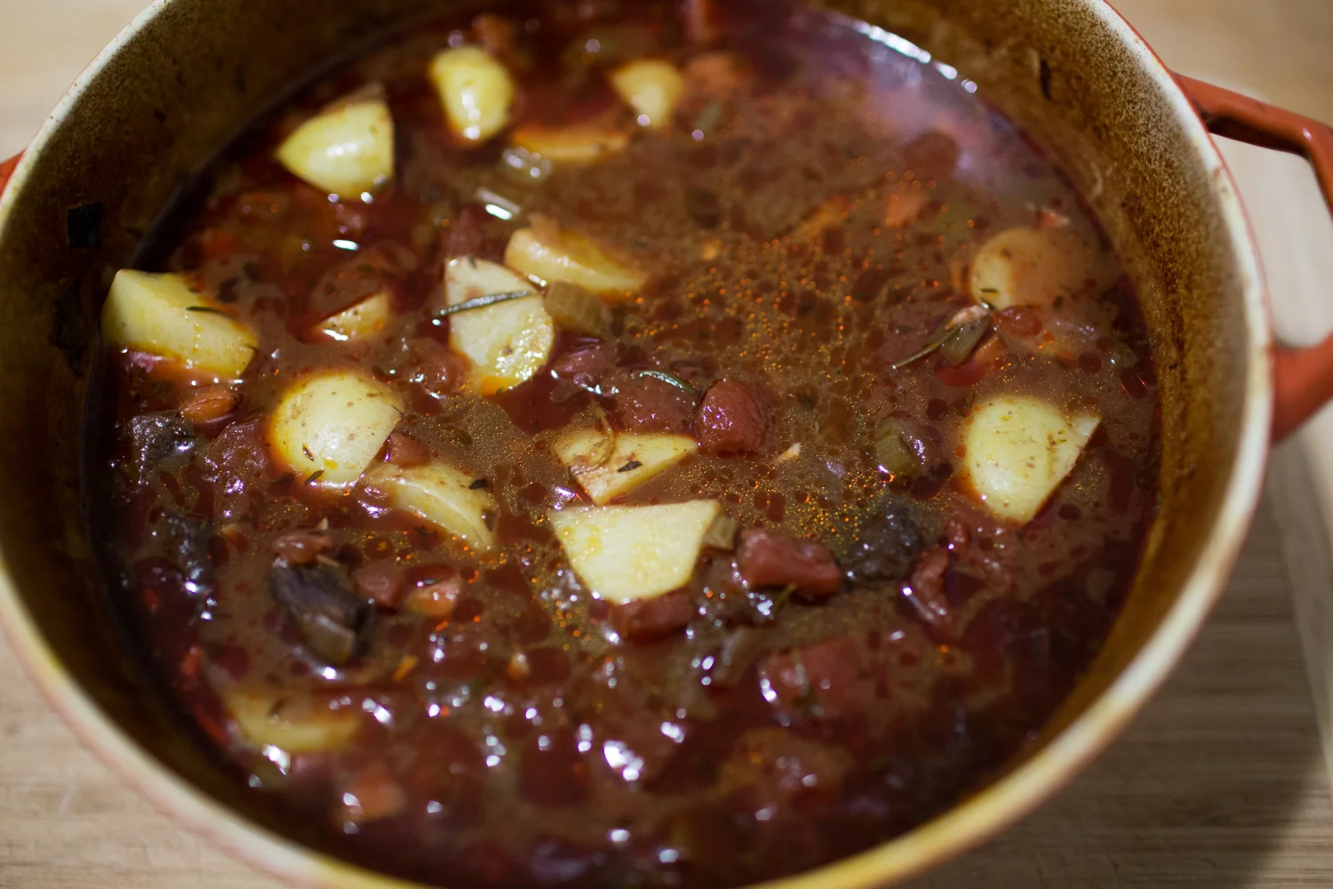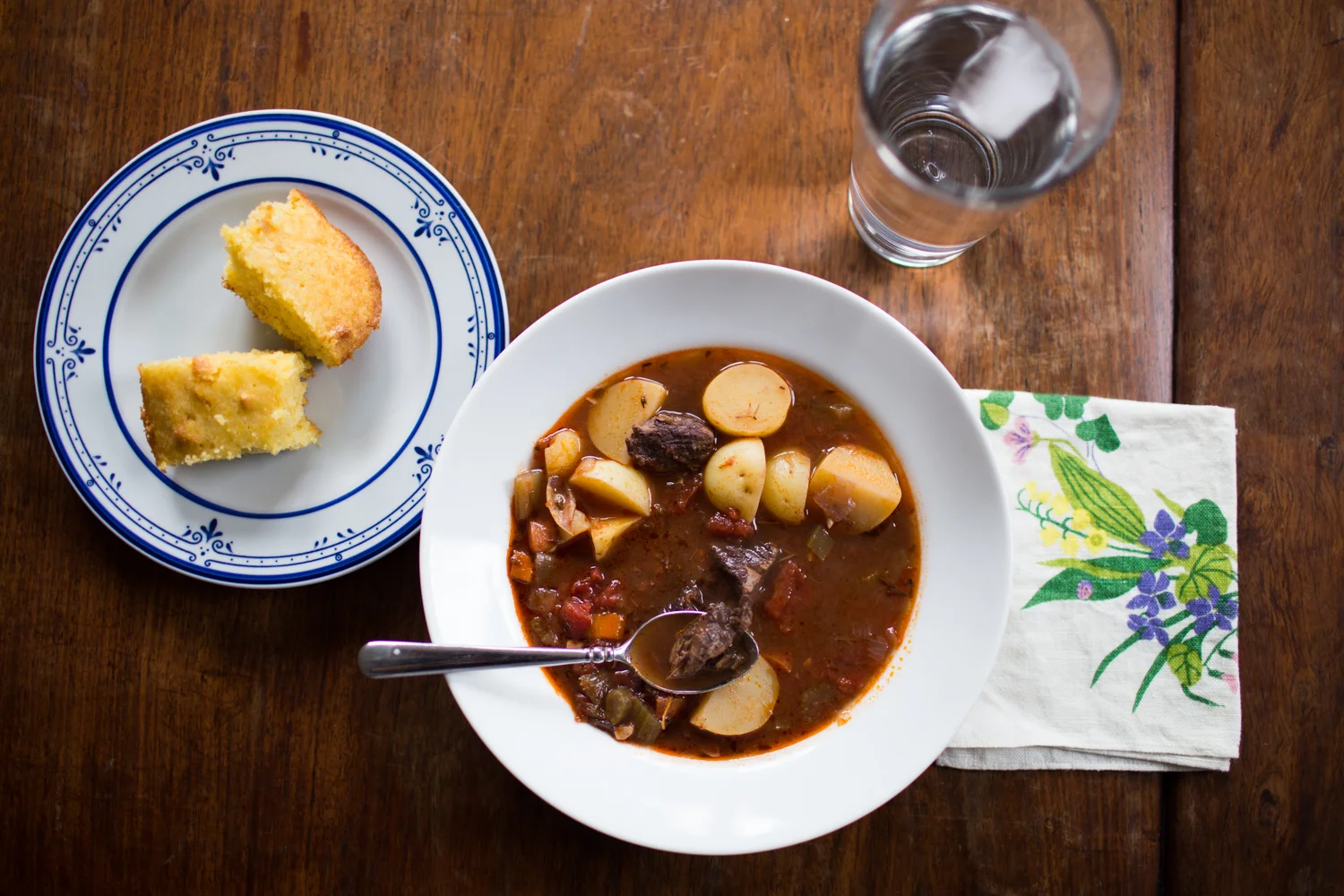 Once beef is tender add stock and potatoes and return to oven until potatoes are done, about 25 minutes. Serve with cornbread. I like Trader Joe's boxed cornbread mix. (Egg noodles would be good too!)