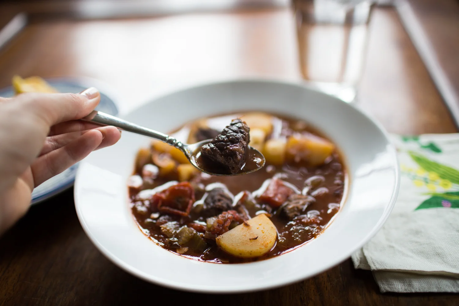I have made a few different beef stew recipes over the years, a beef and Guinness stew made in a slow cooker, Julia Child's beef bourguignon, but this is the one that I always come back to. It's the one that makes my mouth water every time I think of it. I love the acidity of the wine and the tomatoes and the richness of the broth and I love how the beef just falls apart. I especially love how easy it is, the main ingredient being patience. It's a great recipe for a cloudy Sunday afternoon. Recipe adapted from here.