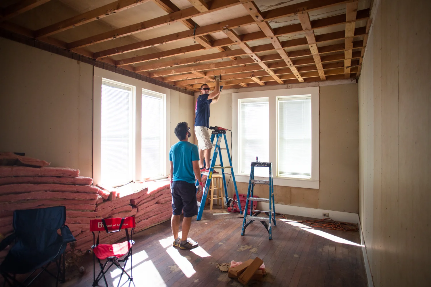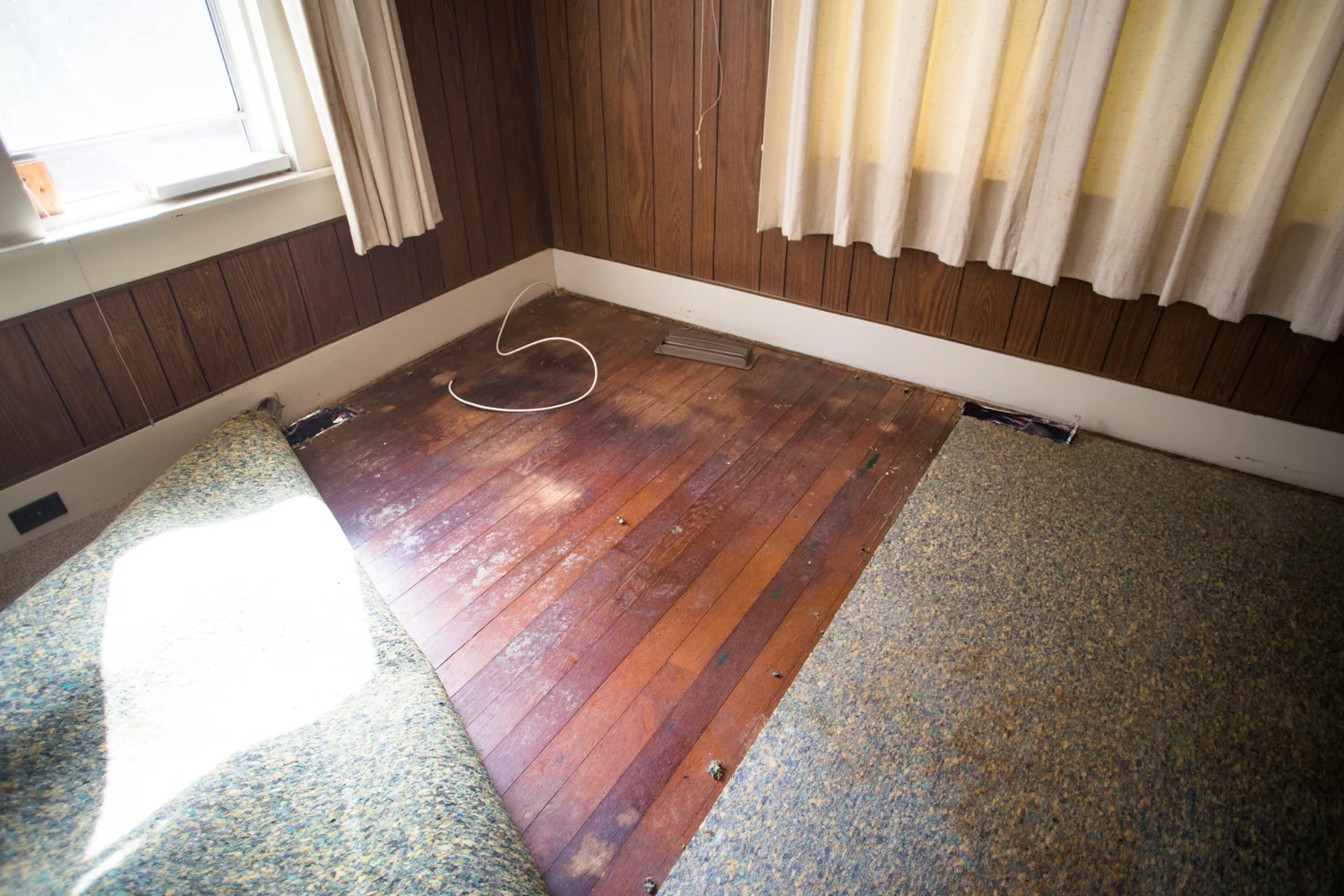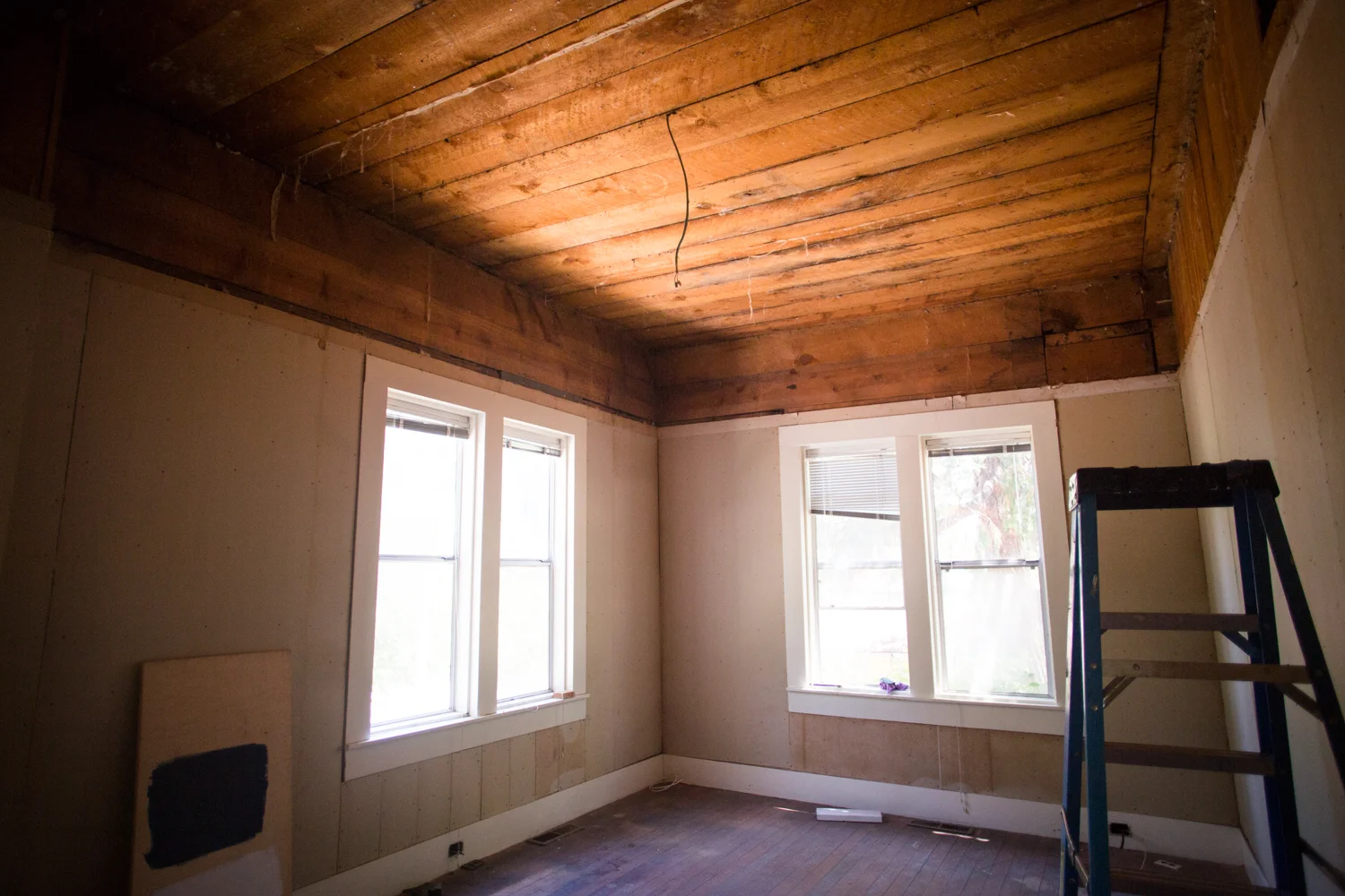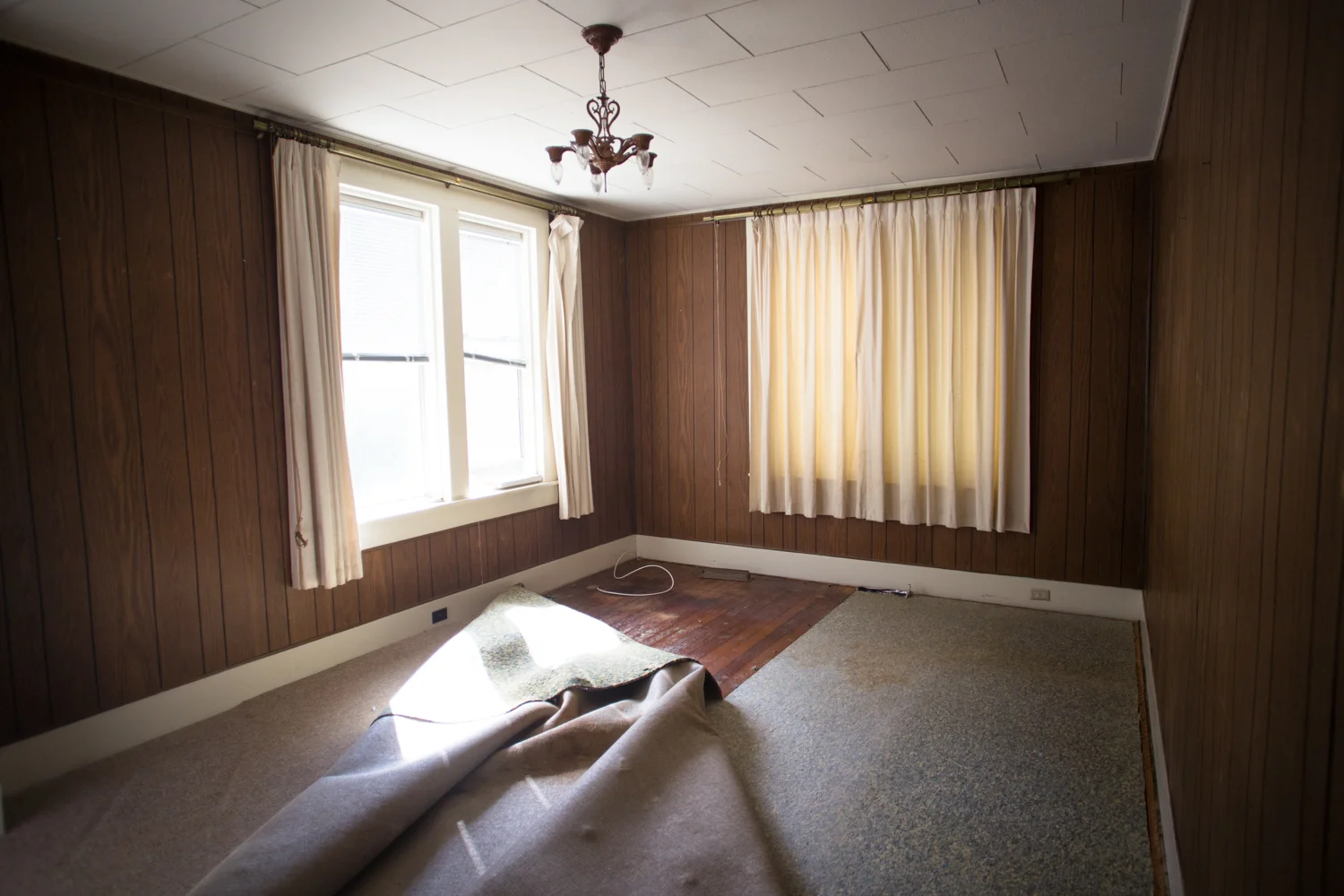 I haven't shared very many interior shots of our home because honestly I was a little scared of what people would think. And I wanted there to be some visible signs of progress. One of the reasons why we fell in love with this house was because of its potential, especially in the living room. When we purchased the house, we didn't know the condition of the floors under the carpets, we only knew they were hardwood. We also didn't know what lurked above the dropped ceilings or behind the wood paneling. But based on the height of the roof, we knew there was space up there, and we hoped we could make it beautiful.