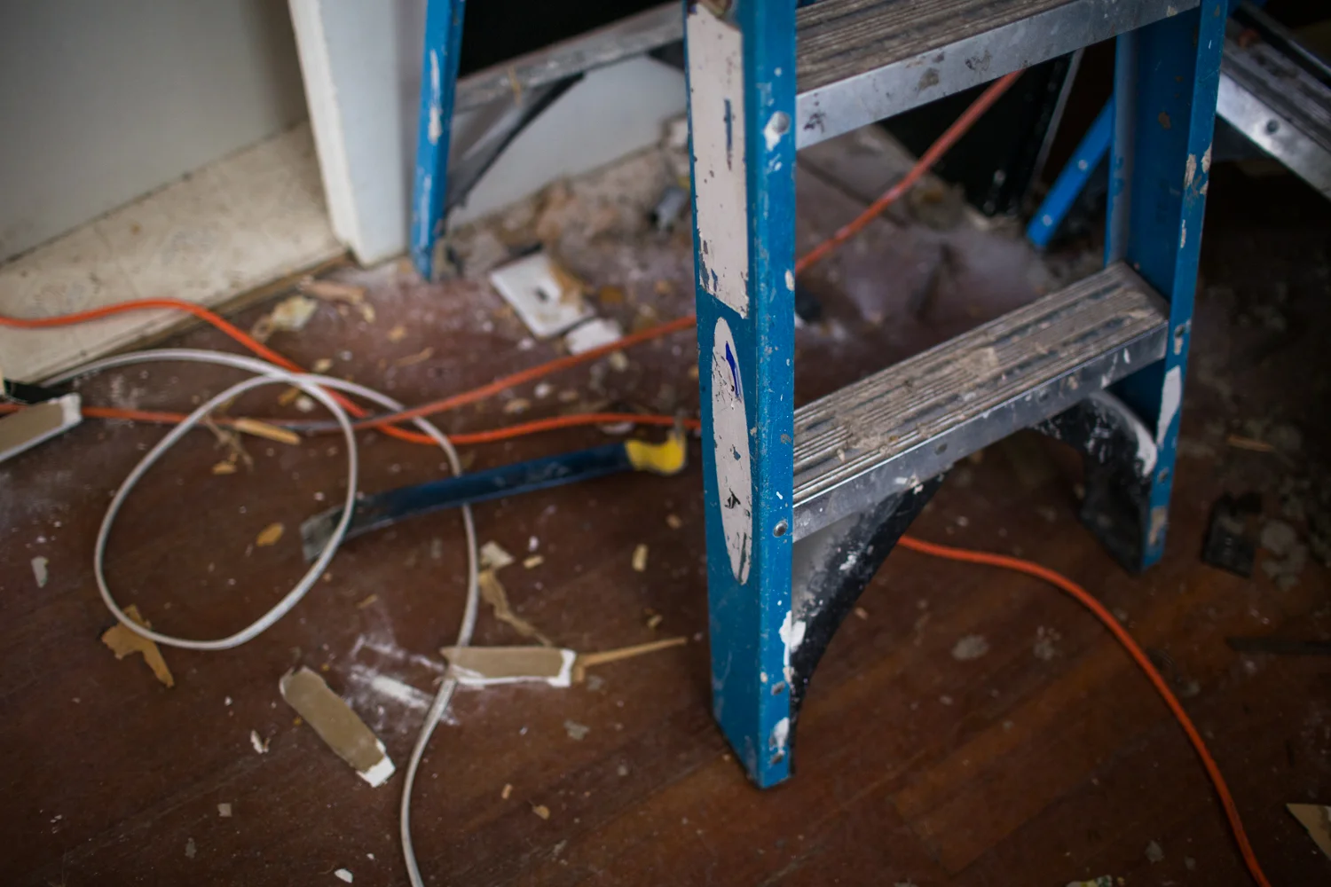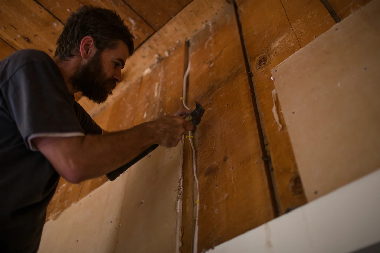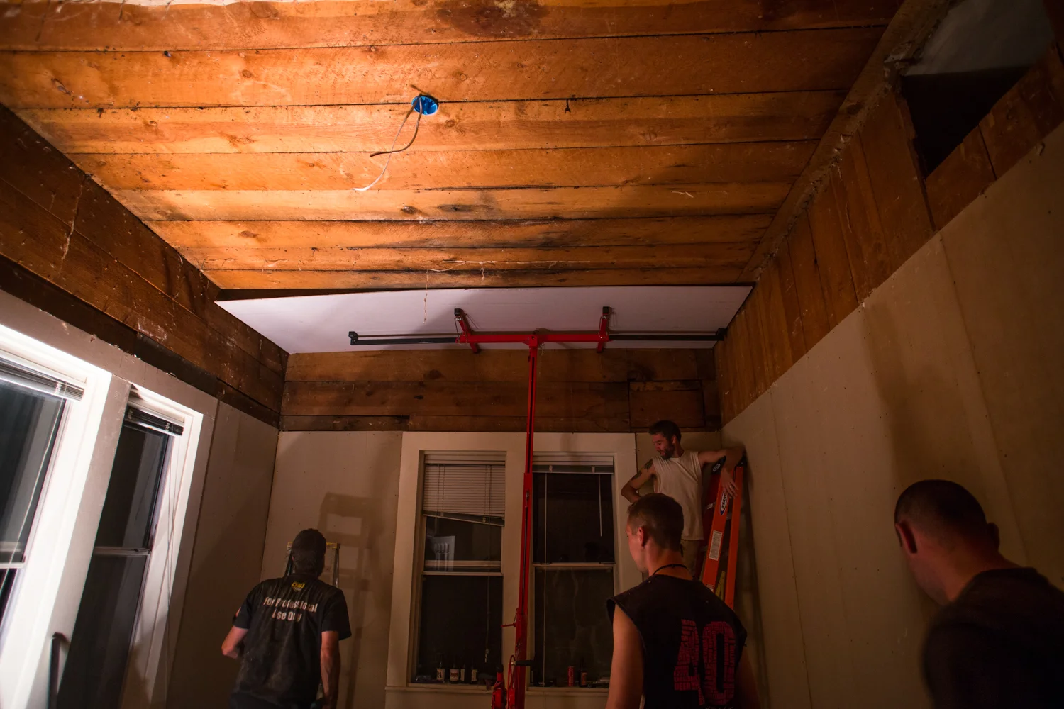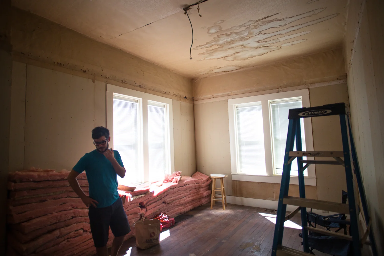 Underneath the carpet was old growth Douglas fir, in excellent condition. It has never been refinished, and we believe it to be over 100 years old. Underneath the fir are beautiful, wide, tongue in groove subfloors that run the opposite direction. Behind the wood paneling was drywall, and above the dropped ceiling was fabric fiber wallpaper, that disintegrated when we touched it, covering cedar planks. All of the original walls in our home are constructed of cedar planks, most of which are covered in drywall (the exception being the walls in the closet in the second bedroom). All in all, the walls are only about an inch and a half thick, leaving no room for insulation or electrical, which had to be run externally or by cutting into the drywall and cedar.