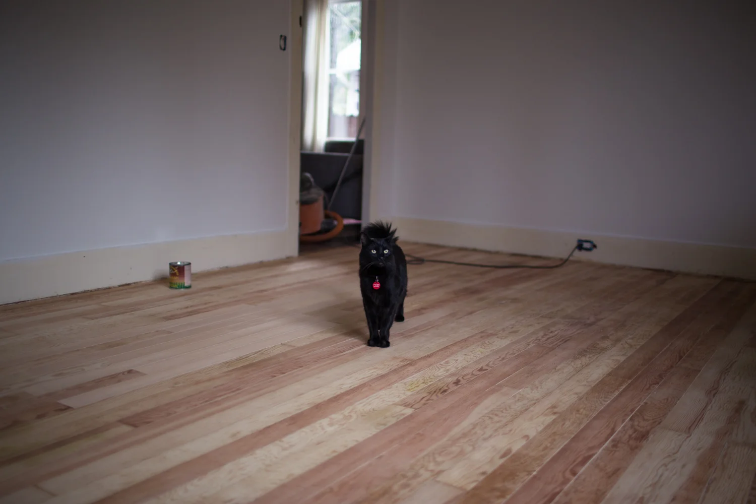 We used Minwax Ultimate Floor Finish in Satin, which is also water-based (no fumes!). Applied the first two coats and did a light sanding before the final coat.