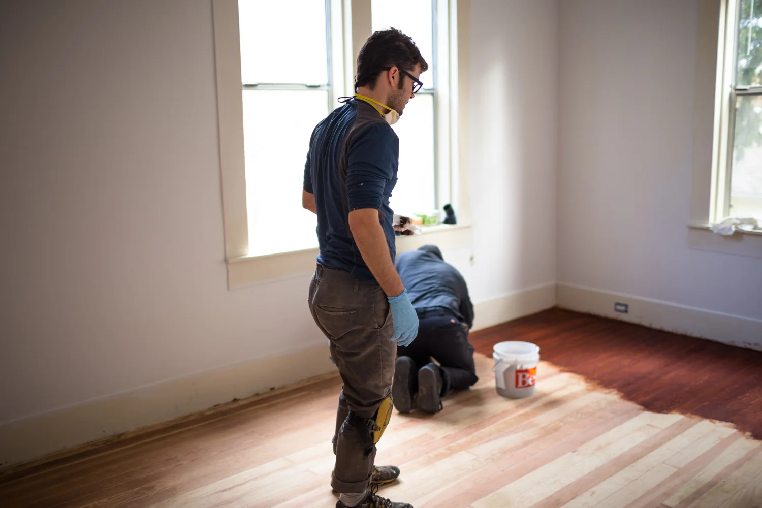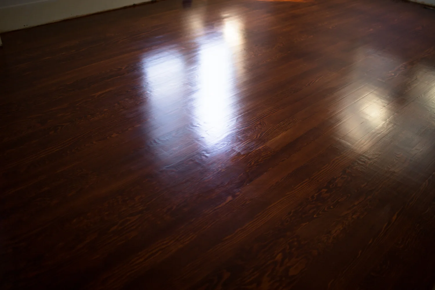 We chose "Black Cherry" by General Finishes, which is a water-based stain. It was the closest we could find to the original floor color, and we love it. Part way through we discovered it was better to apply the stain in the direction of the wood. Live and learn!