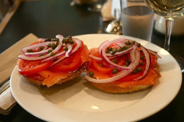 Cafe Sapore serves the best smoked salmon sesame bagels with capers, red onions, tomatoes, and lemon juice.